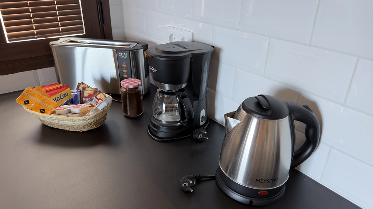 Imagina llegar y tenerlo todo preparado para funcionar desde el primer minuto. Cada apartamento está completamente equipado y orientado a la comodidad real: cocina moderna con lavavajillas, microondas, cafetera de filtro e italiana, tostadora, sandwichera, hervidor, menaje completo… y espacio suficiente para cocinar sin improvisar. Un desayuno pausado o una cena casera aquí salen sin esfuerzo.