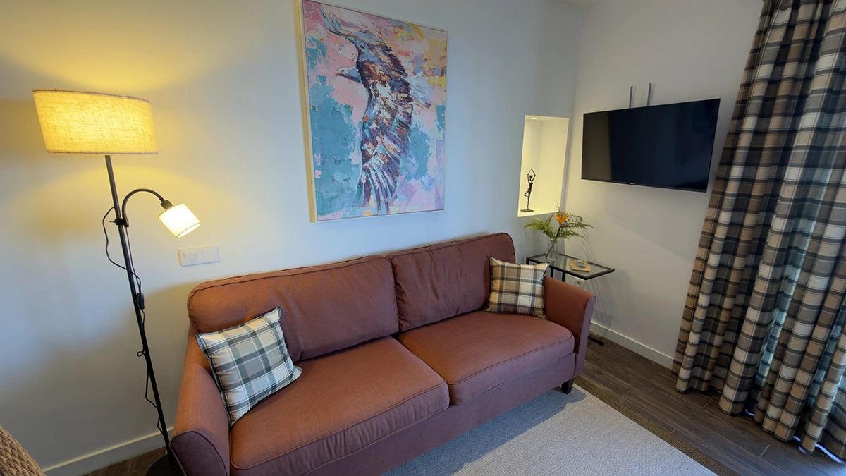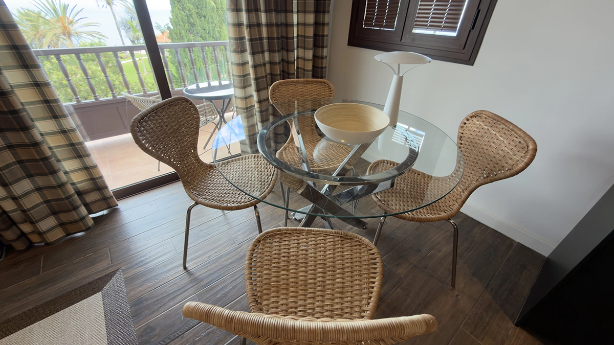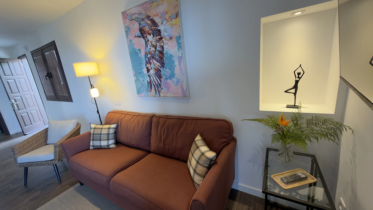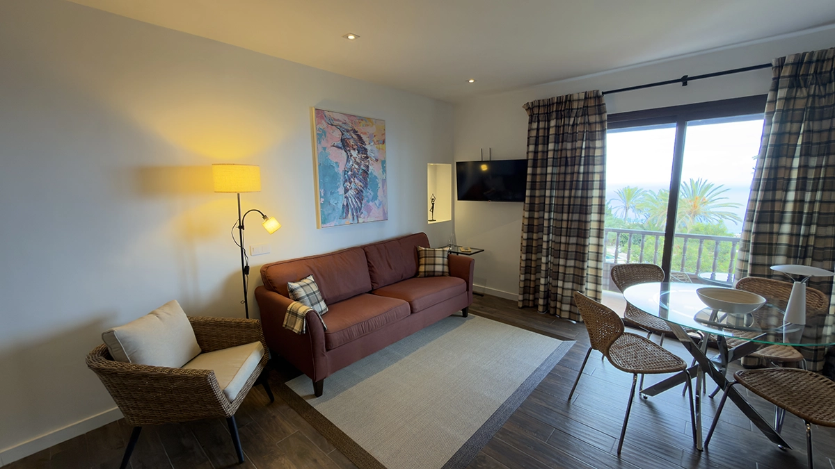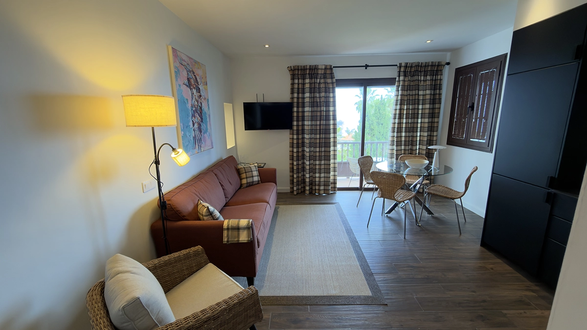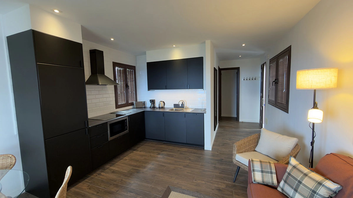 El descanso está igual de cuidado. Los apartamentos cuentan con Smart TV con streaming, satélite Astra y Wi-Fi de alta velocidad, para que puedas desconectar o trabajar si lo necesitas. Los espacios son luminosos y prácticos, y todos los alojamientos incluyen balcón con vistas al mar, donde las primeras luces del día son parte de la experiencia.