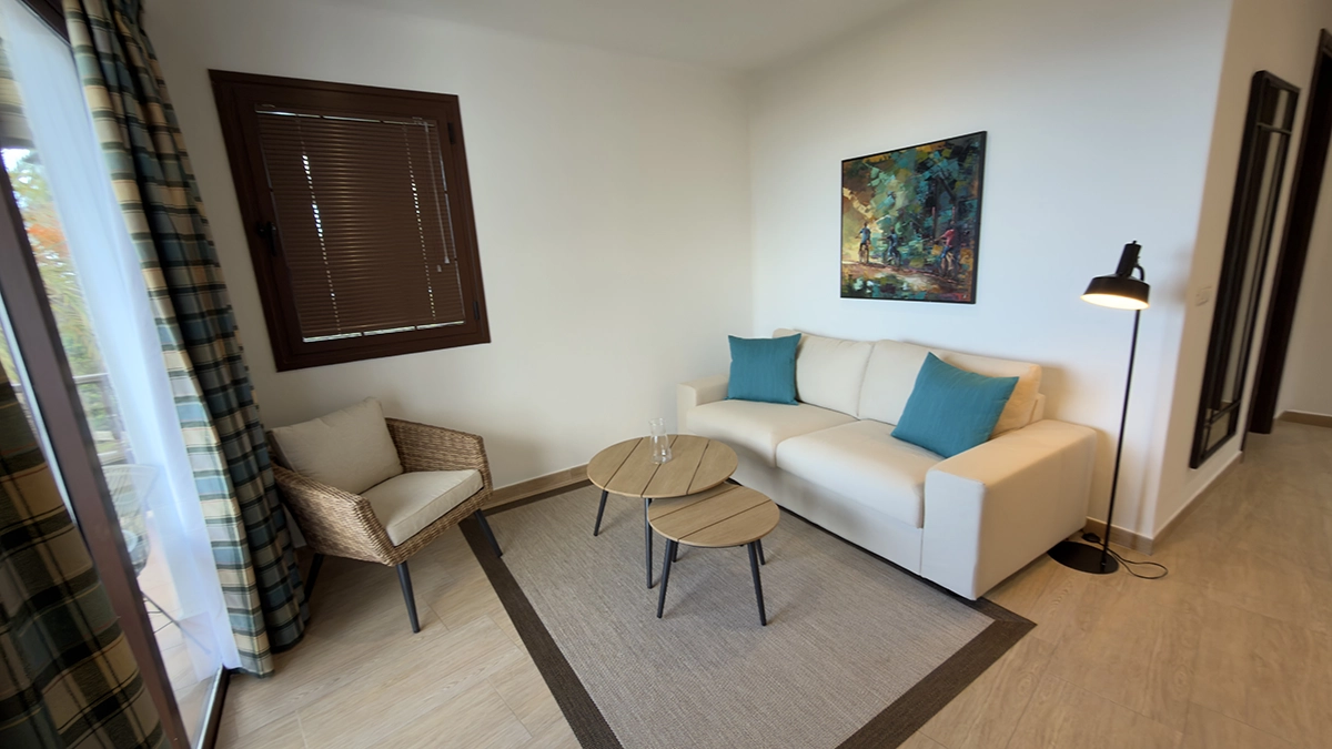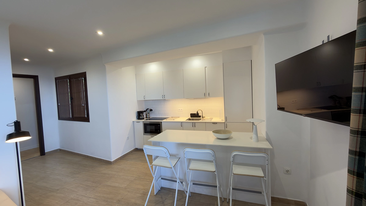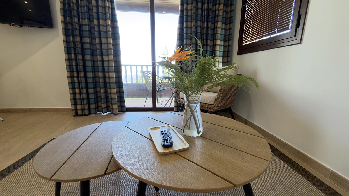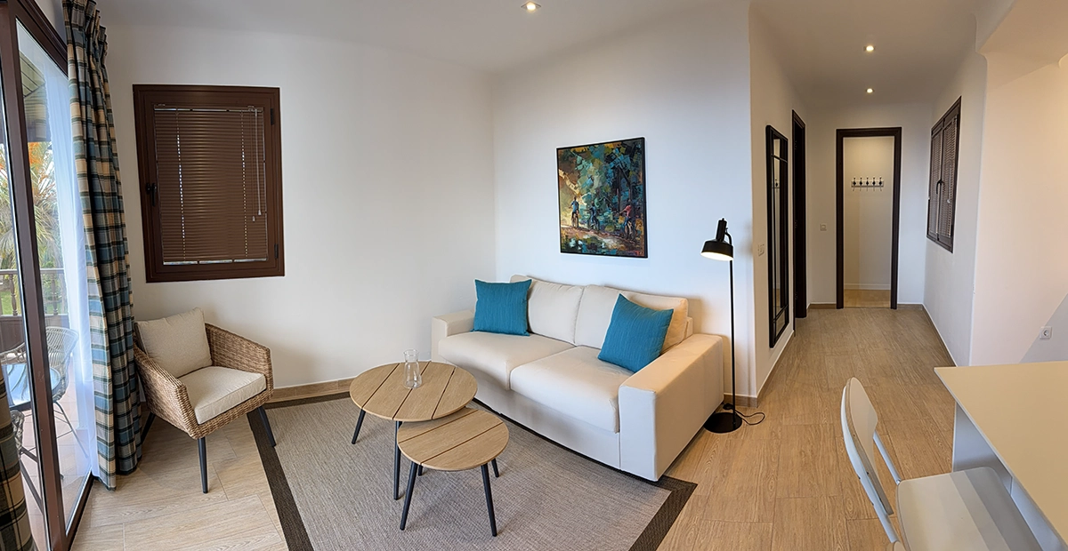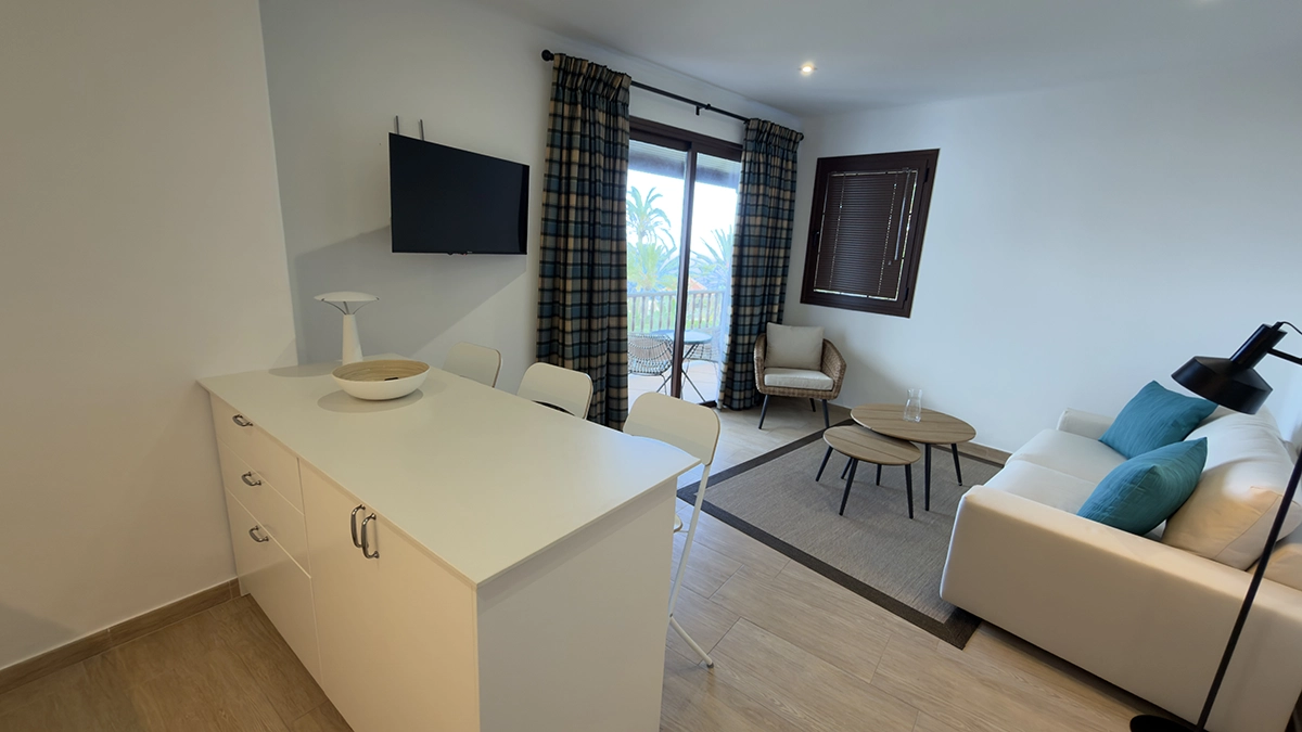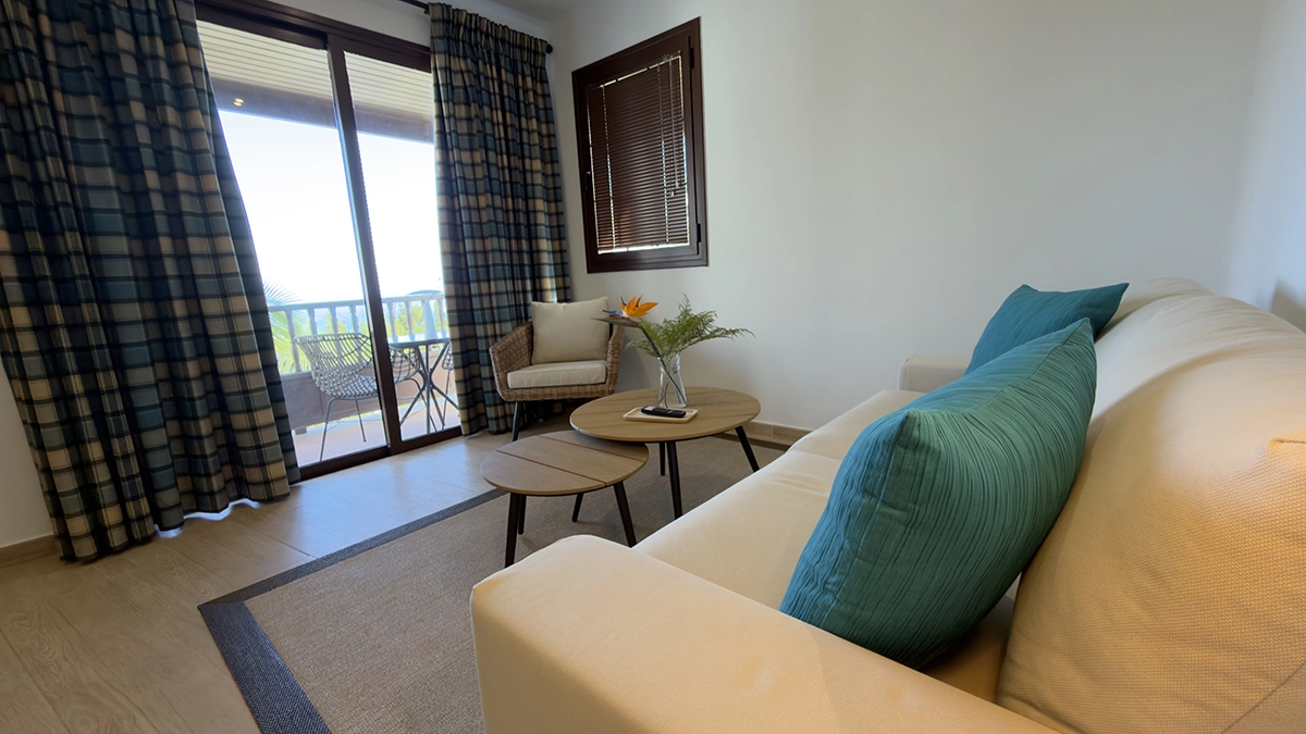 El descanso está igual de cuidado. Los apartamentos cuentan con Smart TV con streaming, satélite Astra y Wi-Fi de alta velocidad, para que puedas desconectar o trabajar si lo necesitas. Los espacios son luminosos y prácticos, y todos los alojamientos incluyen balcón con vistas al mar, donde las primeras luces del día son parte de la experiencia.