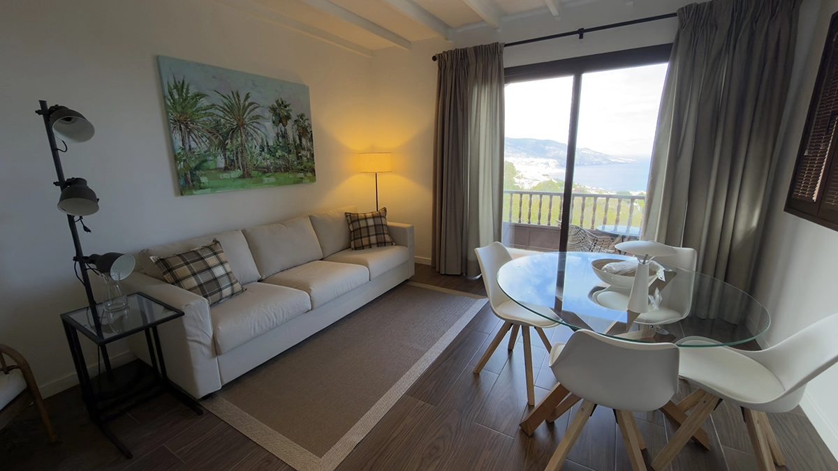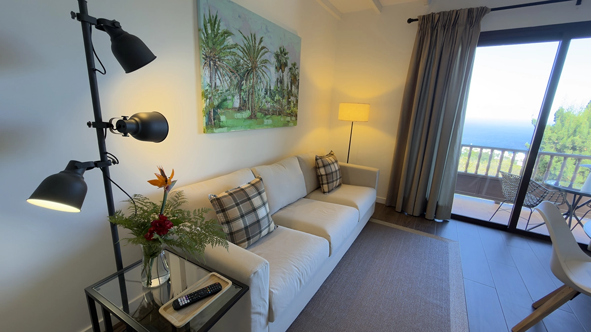 El descanso está igual de cuidado. Los apartamentos cuentan con Smart TV con streaming, satélite Astra y Wi-Fi de alta velocidad, para que puedas desconectar o trabajar si lo necesitas. Los espacios son luminosos y prácticos, y todos los alojamientos incluyen balcón con vistas al mar, donde las primeras luces del día son parte de la experiencia.