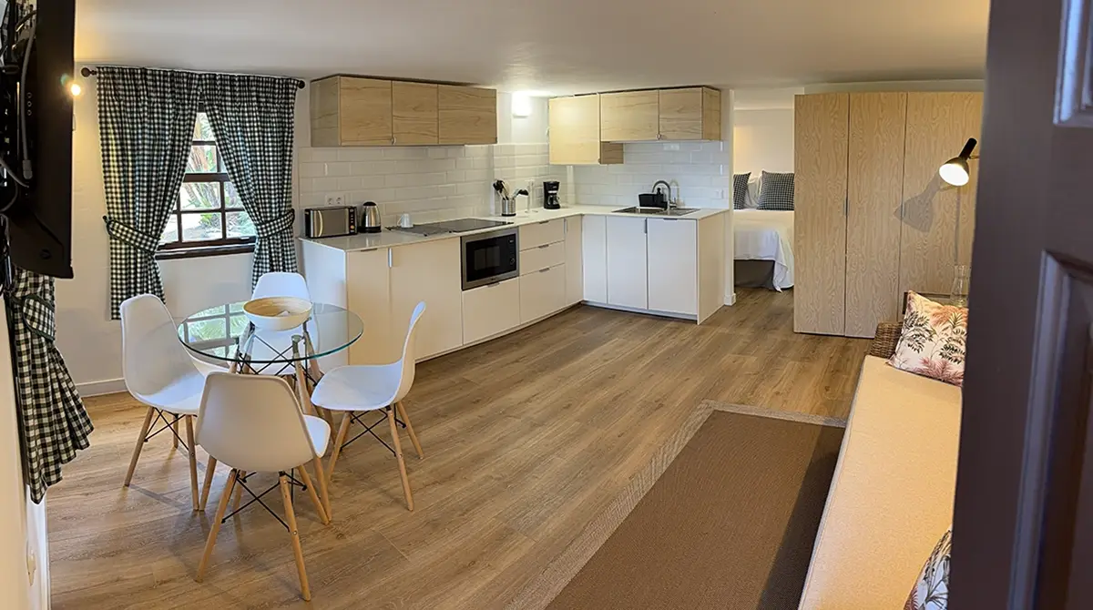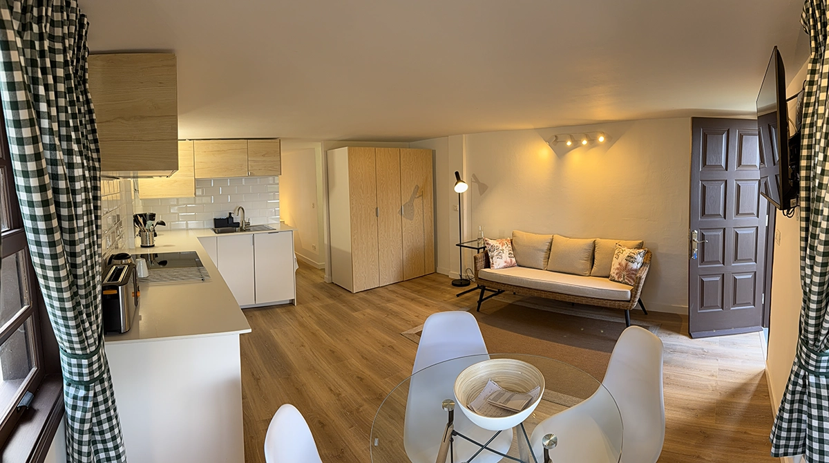 Imagina llegar y tenerlo todo preparado para funcionar desde el primer minuto. Cada apartamento está completamente equipado y orientado a la comodidad real: cocina moderna con lavavajillas, microondas, cafetera de filtro e italiana, tostadora, sandwichera, hervidor, menaje completo… y espacio suficiente para cocinar sin improvisar. Un desayuno pausado o una cena casera aquí salen sin esfuerzo.